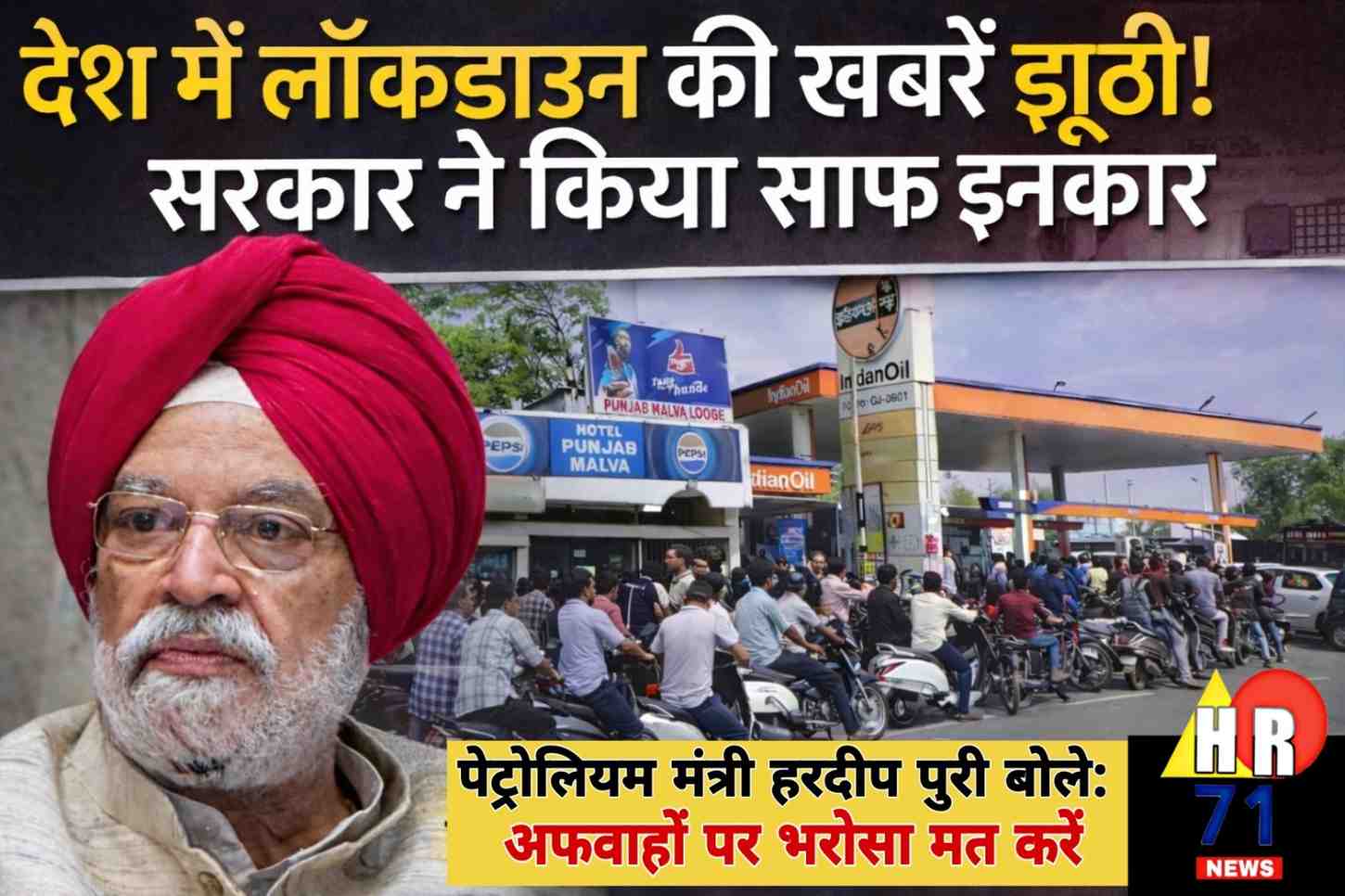 भारत में लॉकडाउन की खबरों पर सरकार ने दिया बड़ा बयान। पेट्रोलियम मंत्री हरदीप पुरी ने अफवाहों को बताया झूठा, कहा- देश में सामान्य स्थिति बनी हुई है।