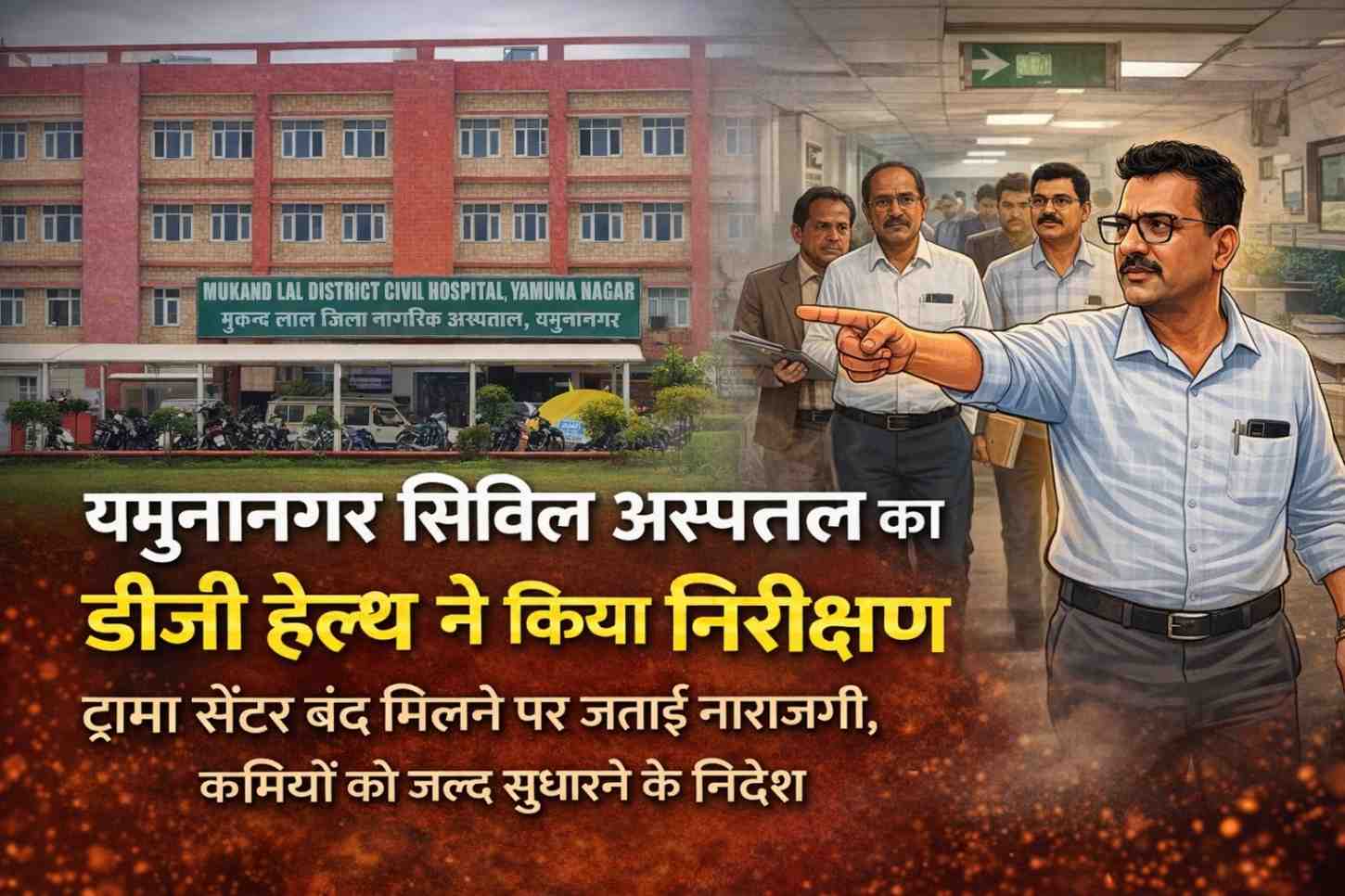 हरियाणा के यमुनानगर जिले में स्थित सिविल अस्पताल का DG हेल्थ (डायरेक्टर जनरल हेल्थ सर्विसेज) ने औचक निरीक्षण किया। इस दौरान अस्पताल की व्यवस्थाओं की गहन जांच की गई, जिसमें कई खामियां सामने आईं।