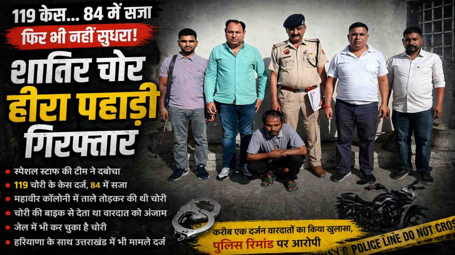 यमुनानगर में पुलिस की स्पेशल स्टाफ टीम ने एक ऐसे शातिर चोर को गिरफ्तार किया है, जिसकी आपराधिक हिस्ट्री सुनकर हर कोई हैरान रह जाए। आरोपी हीरा पहाड़ी पर चोरी के कुल 119 मामले दर्ज हैं, जिनमें से 84 मामलों में उसे सजा भी हो चुकी है। बावजूद इसके, जेल से बाहर आते ही उसने फिर से वारदातों का सिलसिला शुरू कर दिया।