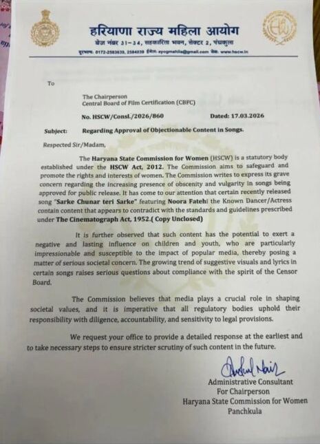 हरियाणा में ‘सरके चुनर तेरी सरके’ गाने पर बवाल, महिला आयोग सख्त — CBFC से मांगा जवाब