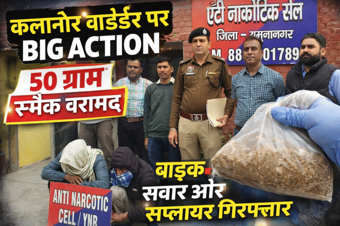 यमुनानगर। जिले में नशे के खिलाफ चलाए जा रहे विशेष अभियान के तहत एंटी नारकोटिक सेल (ANC) की टीम ने बड़ी सफलता हासिल करते हुए कलानौर बॉर्डर से उत्तर प्रदेश की ओर से आ रहे एक बाइक सवार को 50 ग्राम हीरोइन (स्मैक) सहित गिरफ्तार किया है। साथ ही मामले में मुख्य सप्लायर को भी काबू किया गया है।