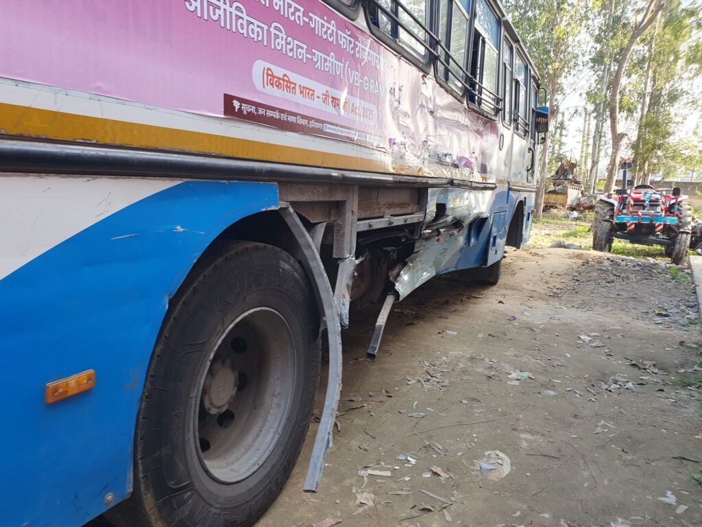 टक्कर के बाद हरियाणा रोडवेज बस की हालत।