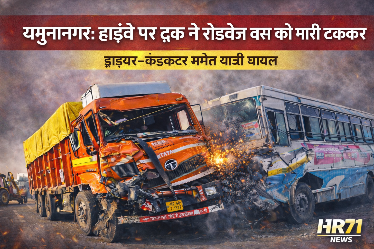 आज यमुनानगर (हरियाणा) के एक राष्ट्रीय हाईवे पर एक गंभीर सड़क हादसा हुआ, जब एक तेज गति से आ रहा ट्रक रोडवेज बस से टकरा गया। इस टक्कर में बस चालक, कंडक्टर और कई यात्रियों को चोटें आईं हैं, और दोनों वाहनों को भी भारी नुकसान हुआ है।