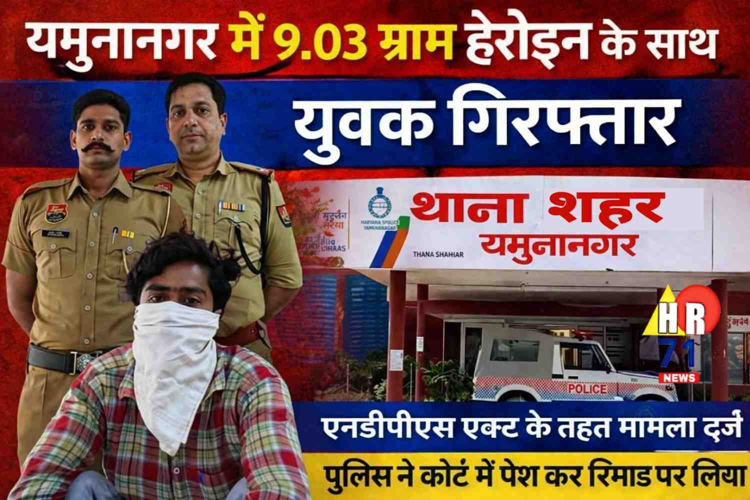 हरियाणा के यमुनानगर जिले में नशे के खिलाफ चलाए जा रहे अभियान के तहत थाना शहर यमुनानगर पुलिस को बड़ी सफलता हाथ लगी है। पुलिस टीम ने एक युवक को 9.03 ग्राम हेरोइन (स्मैक) के साथ गिरफ्तार किया है। आरोपी के खिलाफ एनडीपीएस एक्ट के तहत मामला दर्ज कर उसे कोर्ट में पेश किया गया, जहां से उसे पुलिस रिमांड पर लिया गया है।